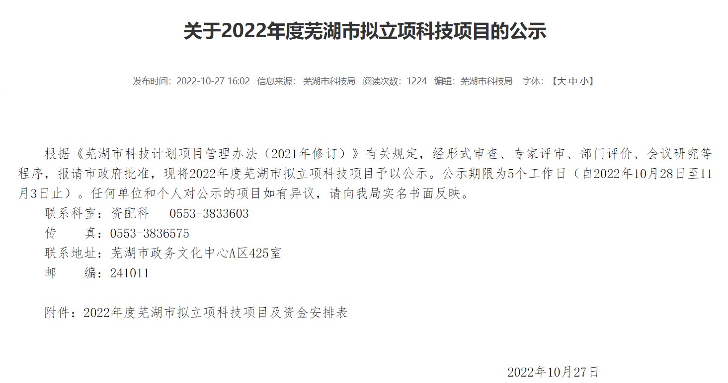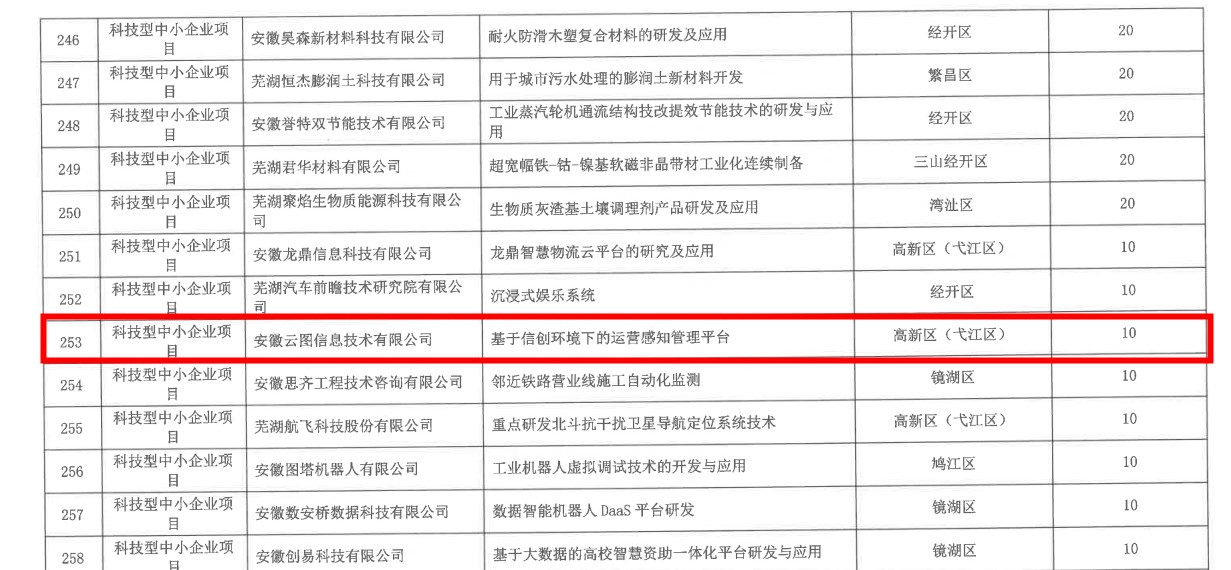 ? ? ? ? ?10月27日,芜湖市科学技术局公布了2022年度芜湖市拟立项科技项目名单。安徽太阳成集团tyc122cc入口凭借基于信创环境下的运营感知管理平台项目榜上有名。