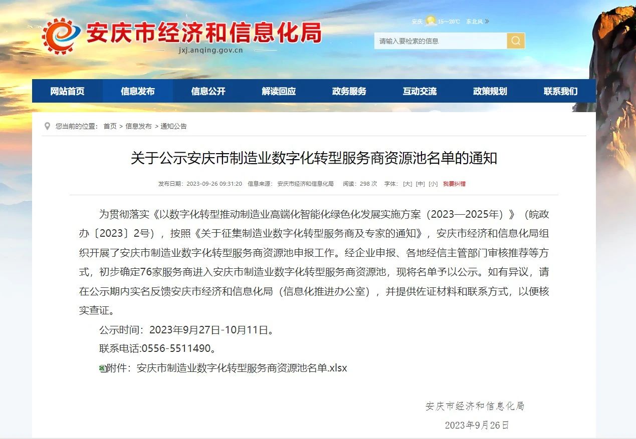 9月26日,安庆市经济和信息化局发布了《关于公示安庆市制造业数字化转型服务商资源池名单的通知》,安徽太阳成集团tyc122cc入口继入选安徽省制造业数字化转型服务商、芜湖市数字化转型服务商后,再次入选市级数字化转型服务商。