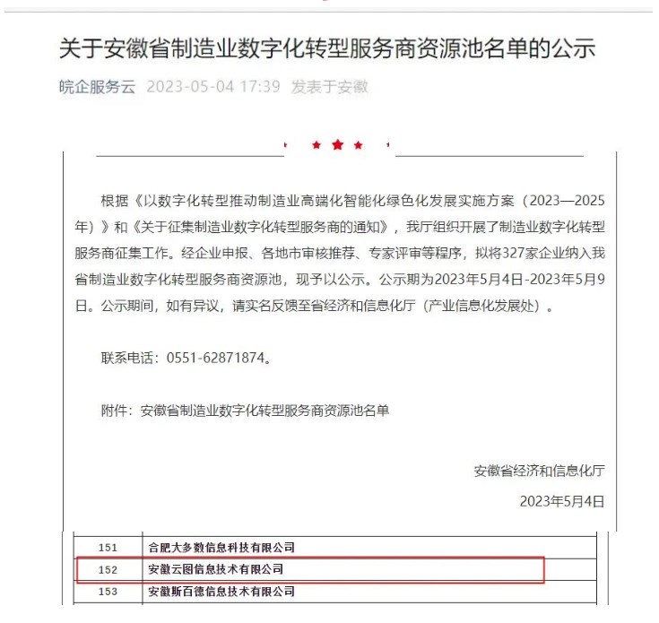 ? ? ? ?2023年5月4日,安徽省经济和信息化厅公布了安徽省制造业数字化转型服务商资源池名单,经过一周的公示期,安徽太阳成集团tyc122cc入口成功入选。欢迎有需求的企事业单位或同行业人士前来交流指导!