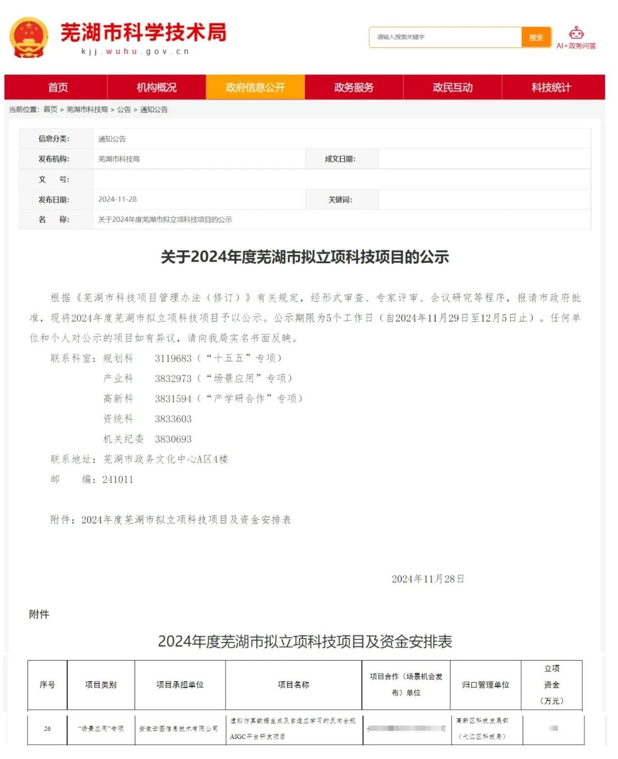 ? ? ? 2024年11月28日,安徽太阳成集团tyc122cc入口信息技术有限公司凭借在仿真数据合成领域的深厚积累,申报的“虚拟仿真数据生成及自适应学习的反向合规AIGC平台研发项目”近日正式被纳入2024年度芜湖市科技局立项科技项目!此次成就不仅是对我司科研实力的认可,更是芜湖市科技局对促进本地科技创新环境和支持高新技术企业发展所作出的积极回应。