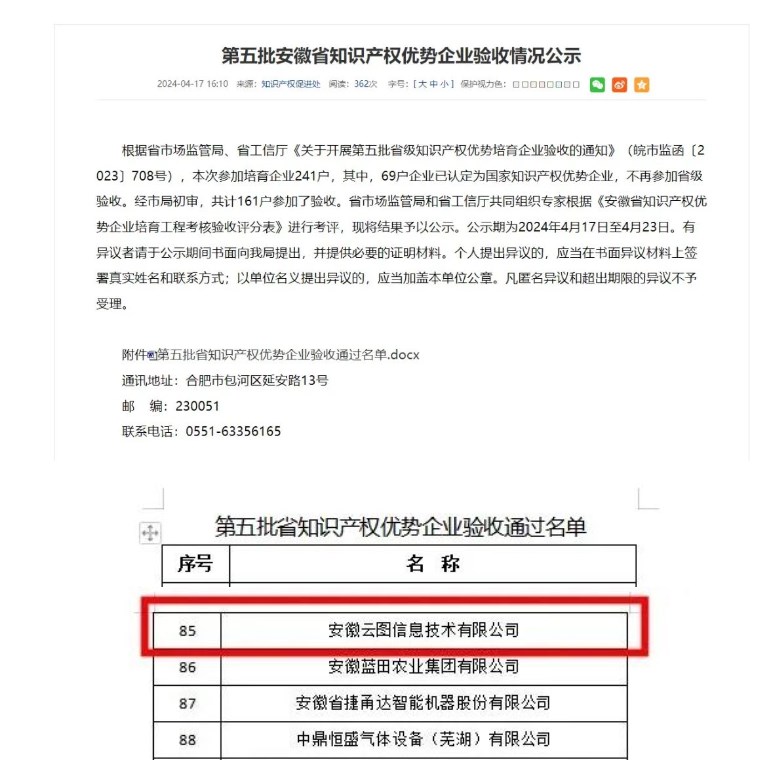 近日,安徽省市场监督管理局公布了第五批安徽省知识产权优势培育企业验收情况公示。安徽太阳成集团tyc122cc入口信息技术有限公司成功通过验收,获评第五批“安徽省知识产权优势企业”。
